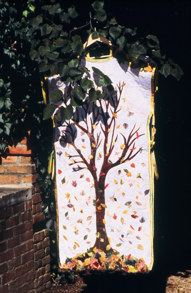 A few days before the class with Anita started I visited my friend John Wood who was in hospice care. After telling him about my busy life he asked me “When are you going to do something for you?” This mantle is my answer to John. I thought about the theme of my mantle “Tree of Life” for many months before I began sewing it. Although I had a vision of what I expected the finished mantle to look like, many of the design ideas happened spontaneously as I work. Sometimes I felt like the mantle was telling me what to do. For example: I decided to make it reversible after I saw the sewn outline of the tree on the inside of the mantle. The two sides of the mantle show two seasons in the cycle of life – fall and winter. The variety of falling leaves can be compared to the great variety of people who live together on earth. Although we each live a unique life, ultimately we all have the same ending. LIVE YOUR DREAMS AND BELIEVE IN YOUR VISIONS.
