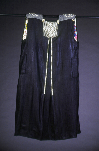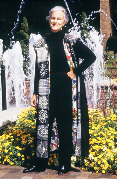 When the mantle project was first proposed to the members of the North Shore Weavers Guild, I was immediately captured. Over the past two years, I’ve thought a lot about the mantle making many statements. Black and white describe my appearance and thoughts, little room for gray. Buttons recall memories of special occasions, pearls stand for some of my “Pearls of Wisdom” collected over the years and the colorful lining represents all the color I have inside me that I’m challenged to bring out in an artistic way. * Reach for the Moon – you’ll land in the Stars! * When you feel good – notify your face. * I’ve always wanted to be somebody – now I see I should have been more specific! * Make it new, beautiful, and oddly pure.