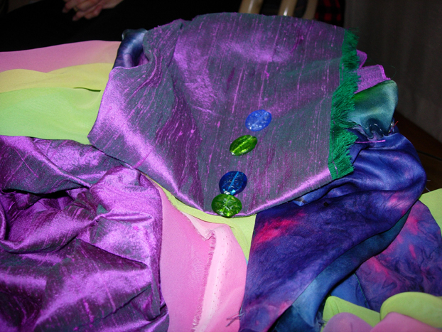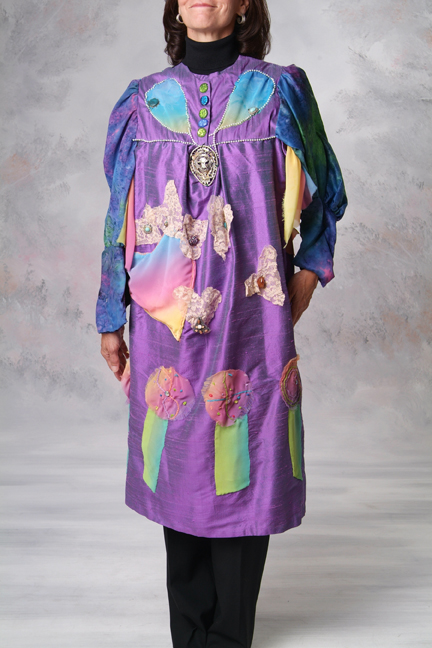 The genesis of my robe stems from my baby coat of embroidered blue silk, a long coat with a yoke and pearl buttons down the front. As the first and oldest child, so elegantly dressed, I must have felt like a little queen. On my robe, symbols of a lioness queen and spirals represent power. The buttons are Venetian and to me symbolize beauty. My intention is to honor the inner queen, expressing spirituality within each of us, either latent or dynamic. It is remarkable to me that this early childhood feeling continues to inspire my art work.