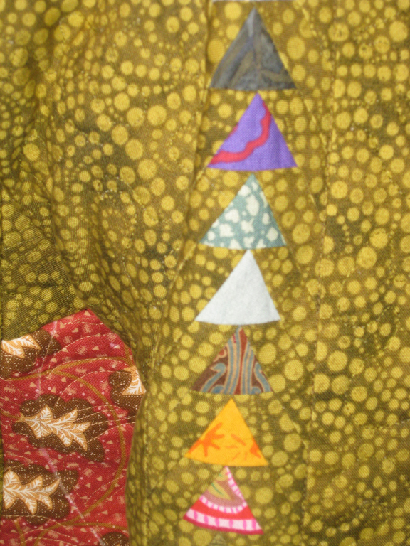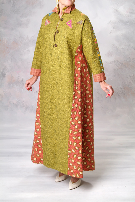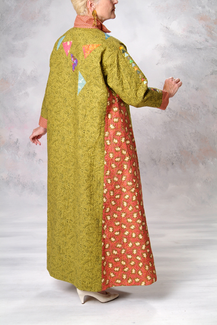 This is a gardener’s robe... Something to wear sitting on the deck on cool Summer mornings and Fall nights or in a comfy chair leafing through seed catalogs in Winter and Spring. My garden started with Spiderwarts and Day Lilies. Fiddlehead Ferns and Comfrey came over from the neighbor’s yard. Through the years, plants and fruit trees have replaced grass. The Comfrey is now contained but the Fiddleheads continue their dance through the yard. Lady Bird Johnson died while I was making this robe. Lady Bird promoted conservation using native plants and wildflowers. Mrs. Johnson’s beautification campaign planted flowers and trees on historic sites, in national parks and along highways. As I sewed, listening to tributes to Mrs. Johnson, I thought of other Texas women who have enriched my life - Marie Budewig, Molly Ivins, Emily Robison, Martie Maguire and Natalie Maines - with beauty, kindness, wit and courage.