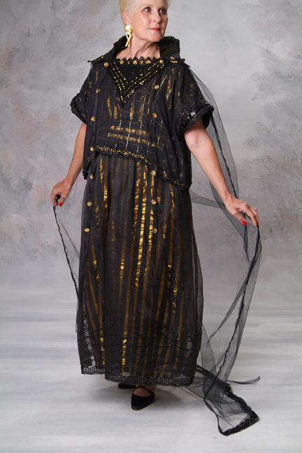 There have been many amazing women in my life. Adrienne Goldberg was one of them. She was a wonderful artist, a renaissance woman, creative, fascinated by life, and ceaselessly curious. Her artistic passion was pressed in many mediums: drawing, painting, sculpting and quilting. Our conversations were a powerful influence on my creative process. They expanded my aesthetic vision and encouraged me to experiment with new materials. I often begin my fiber work with an existing garment whose materials and history inspire and inform the development of the rest of the piece. In this instance I used as the first layer of my robe a gold and black sheer caftan that belonged to Adrienne. As a first step I cut down and reconstructed her garment saving all the extra material to be used in creating original embellishments for other layers. Rather than using a pattern, I developed my robe by draping and pinning the fabrics on a manikin, building each layer as it came to me in a process much like collage. My garment is constructed using both machine and hand stitching. It contains a variety of sheer fabrics as well as lace, sequins, ribbon and beads. I created the small decorative flower elements with gold lame and tiny buttons. The style of my garment was also influenced by my study of centuries of unique designs in women’s fashion. Adrienne remains a presence in my life and the layers of the life experience she shared with me are reflected in the layering of my garment. I have been blessed with many wonderful women in my life including my Mother, Ruth Krebs and my Aunt, Anne Barbery. As my robe came together, I thought of them, their dynamic complex personalities, their joys and sorrows, and their triumphant spirits. They each used artistry in creating and living their lives and were “Queens” in their own special way. My robe honors the memory of all of them as they continue to guide me on my journey.