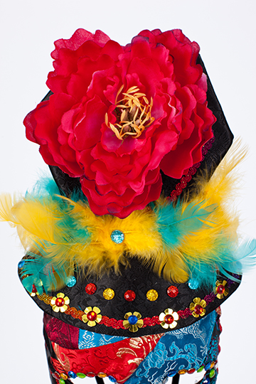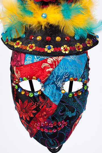 My husband and I toured China last fall. Everything we saw created lasting memories. Throughout the trip, we saw dozens of extraordinary masks. Building on the memories became a natural inspiration for my mask. My starting point was the colors I thought best represented what I saw: the red of poppies, the golden yellow reserved for Chinese emperors and bright blues of costumes at both the Peking opera and the Tang Dynasty Theater. Further, I knew the perfect place to begin—the little bag of scraps acquired during the Yangtze River cruise by a fellow traveler who asked the tailors on board for them. I pieced a small sampling of the beautiful silk brocade scraps and that “fabric” is the face of my mask, and hat. After that, the rest fell into place. True, there were challenges along the way. How to join the two sections was attempted by using Velcro but ultimately resolved by using the hot glue gun. At first I thought of calling my mask “Made in China.” But my impressions of China were more positive than the connotations associated with the use of that phrase. Because the brocades came from the cruise portion of the trip, I decided to name my mask “Yangtze Memories.” |
