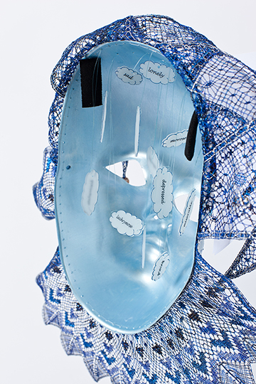 This mask is based on the style of a Venetian Wall Mask. I chose a Jester in Blue to symbolize the way many of us present a happy, bright exterior, saying “I’m fine, thank you” to all-comers, while inside feeling blue -- sad, lonely & depressed. The hat and ruff are worked in traditional bobbin lace stitches, using contemporary metallic threads and fine wires to support the edges. The thought bubbles, inside the head, were printed on Shrink Plastic. |