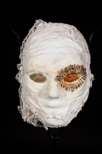 This mask tells the story of how our life experiences add various layers on our mask. Inside, the colors represent light, faith, serenity, and passion. These emotions shape our thoughts, our perspective and our drive for life. These shades also reflect some of the harshness in our character that shape us as well: greed, jealousy, anger or indifference that can affect every aspect of our interactions yet are hidden on the inside. Wearing this mask projects only what we choose to reveal. We see the inner soul shining out through the eyes: one is stronger and more brilliant, other clouded by the mask. Wrinkles and creases form in the fabric around the eyes and forehead, years of worry writing their story upon the mask. There are tearstains on the cheeks from hurts. The lace represents an outward grace that we put on, full of poise and dignity. Even the mouth is covered in light layers of lace and silk, as we realize how essential it is to let our words mask our inner light. At the edge of the mask, the fabrics become heavier and more layered. These small bits of memory are added with time, experiences, and lessons that shape who we are. Their varying textures and shades of white add dimension and interest to the mask. Our masks are never finished, but an evolving piece of who we are. Gleaming, shimmering and reflective beads draw your attention to the inner soul like sunbeams dancing, raindrops lingering, and glory radiating. Let’s focus on the light melting through our mask’s layers. |