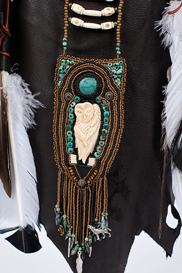 My spirit mask is loosely based on a Native American Shaman spirit mask. I have attempted to capture the essence of my spirit through research of various astrological charts and also things with which I feel a deep connection. I was born under the sign of the owl according to Native American astrology and my clan animal is the thunderbird. Celtic astrology has my sign as the falcon or hawk. Owls are symbols of wisdom, adventure and independence. Thunderbirds, eagles and hawks are all animals associated with spirit, creativity and intention. It is also interesting that according to western astrology my ruling planet is Jupiter, which is symbolized by the eagle. So, it is obvious that birds of prey are a major influence on my spirit. Although birds of prey hunt & feed on other animals, they are characterized by their keen vision and their power. My Native American horoscope suggests my colors are gold and black and my minerals are obsidian and turquoise. I painted my mask black and reddish brown, the colors of obsidian. I have also used black leather, turquoise and black beads and just a touch of gold using brass beads. Yoga is a major part of my life these days. It has provoked a fascination with chakras and their impact on our life. The top spiral portion of a conch shell is embedded in the forehead or ‘third eye’ area. Hindu tradition says the ‘third eye’ (Ajna in Sanskrit) is our 6th chakra and translates to ‘command’. It is associated with our intuition and intellect. I would like to think that I have always been quite intuitive and intellect reinforces the wisdom of the owl. The spiral of the shell symbolizes awareness, connection, and balance-all the things I am learning through yoga. The crown of seashells signifies my love of the ocean and seashore. Crowns are also associated with the planet Jupiter. A carved bone owl is the centerpiece on my ‘protective’ breastplate/necklace. Various elements adorn my mask: feathers to symbolize all the birds I associate with; real horsehair braids dangling from either side of her head-because I love their power and grace; and a selection of charms chosen to represent a few other things that are dear to me. As you can see my spirit is multi-faceted with a deep connection to the animal kingdom and nature. |