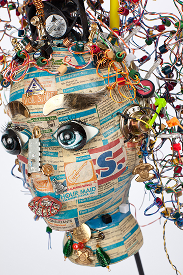 My aunt and mother came to Chicago in the 1920’s from a rural area in central Illinois and in time found employment in Wilmette with Illinois Bell (AT&T), answering calls at the switchboard. They remained and retired after each had served forty-five years of service. I succumbed to working for AT&T for a short time as well in the early 1960’s. Communication has transformed from the 3-party line to everybody’s on board with everyone else’s business (more than I personally care to know about). Indeed, what have we gained and what have we lost? Will today’s young people remember how to speak to each other? Observing body language and hearing the inflection of the human voice: Are these things of the past? My mask, adorned with trinkets received for service to AT&T, reflects the change from earlier days to the current age of the computer, email, texts, web pages, Facebook, Skype etc. It also reflects my family’s traditions and experience. My frustration, ineptness, and disconnect with the new way of personal and impersonal methods of communication is expressed through the materials I used to create my work. |