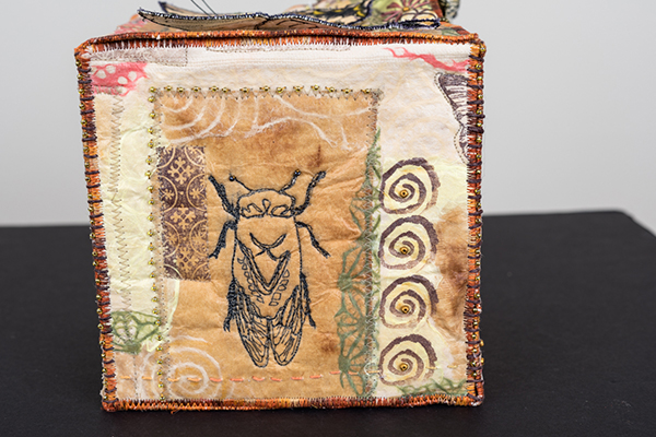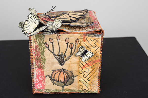 Elements of nature have been collected and categorized since the beginning of humankind. ‘Butterfly Box’ is my personal version of a cabinet of curiosities, a place to display and enjoy the many treasures of the natural world. Nature provides an endless supply of beauty, inspiration, education and wonder. Keeping our eyes open is the key to delightful discovery. Process: Linen base layered with handmade papers, teabags, vintage and stamped images. Embellished with hand and machine stitching, beading and machine stitched butterflies. |