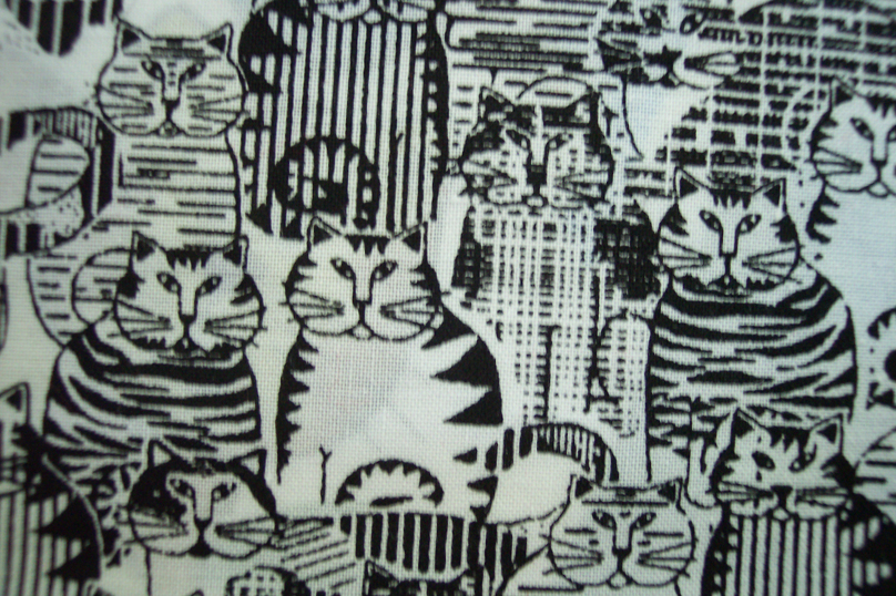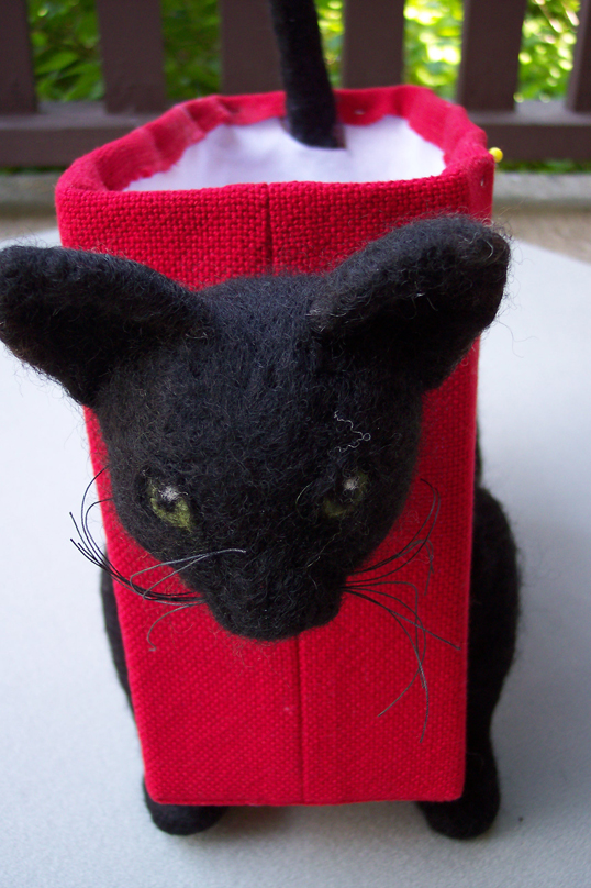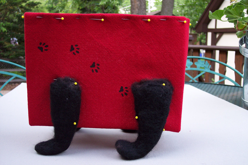 One January, while returning to Chicago from Florida, my plane was diverted to Kentucky because of dense fog in Chicago. My traveling companion was my cat, Mr. B. Our adventure during this sojourn is the basis for my purse. During our overnight motel stay, Mr. B. refused to use the make-shift box I had arranged for him to use to relieve himself. By morning I became concerned. Hearing that our flight would not take off before noon, I decided to take him out behind the motel to see if this would help. It was raining and just barely light when our adventure began. He managed to pull completely out of his harness and took off towards the nearby woods. Twice I captured him and almost got him back into his carrying bag. Each time he managed to escape before I could secure the zipper. On the third try, with the help of some cat treats and a pair of heavy gloves, I managed to grab him, shove him into the bag and get the zipper closed. At the airport, security asked me to remove him from the bag so they could inspect it. I explained what had happened and why I didn't want to "let the cat out of the bag again". Their reply was "go on". |