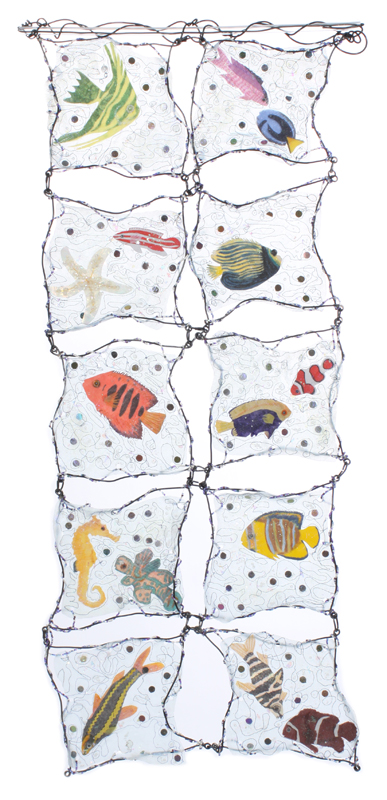 Reflections! “Water, cool clear water” Fifteen exotic fish swim among the Shisha mirrors, (often used in Indian ladies’ saris) with glitter and beads imitating bubbles. They cover the color spectrum of red, orange, yellow, green, blue and violet. The fish were copied free-hand from library books. Using polyester sheer fabric and tulle for the bodies they are decorate with fused fabric, paint, dye, colored pencils and markers. The eyes were made of beads except for the blue and yellow Emperor Angelfish. His eye is a black wire spiral. Stiffened sheer fabric formed the background for the panels. A layer of tulle covering the fish, shisha mirrors and beads was stitched in place with free-motion machine embroidery. Electrical wire frames undulate around the free-form segments. Strands of water colored beads lace them together. Another length of the wire threaded through the top tube supports the frames. |